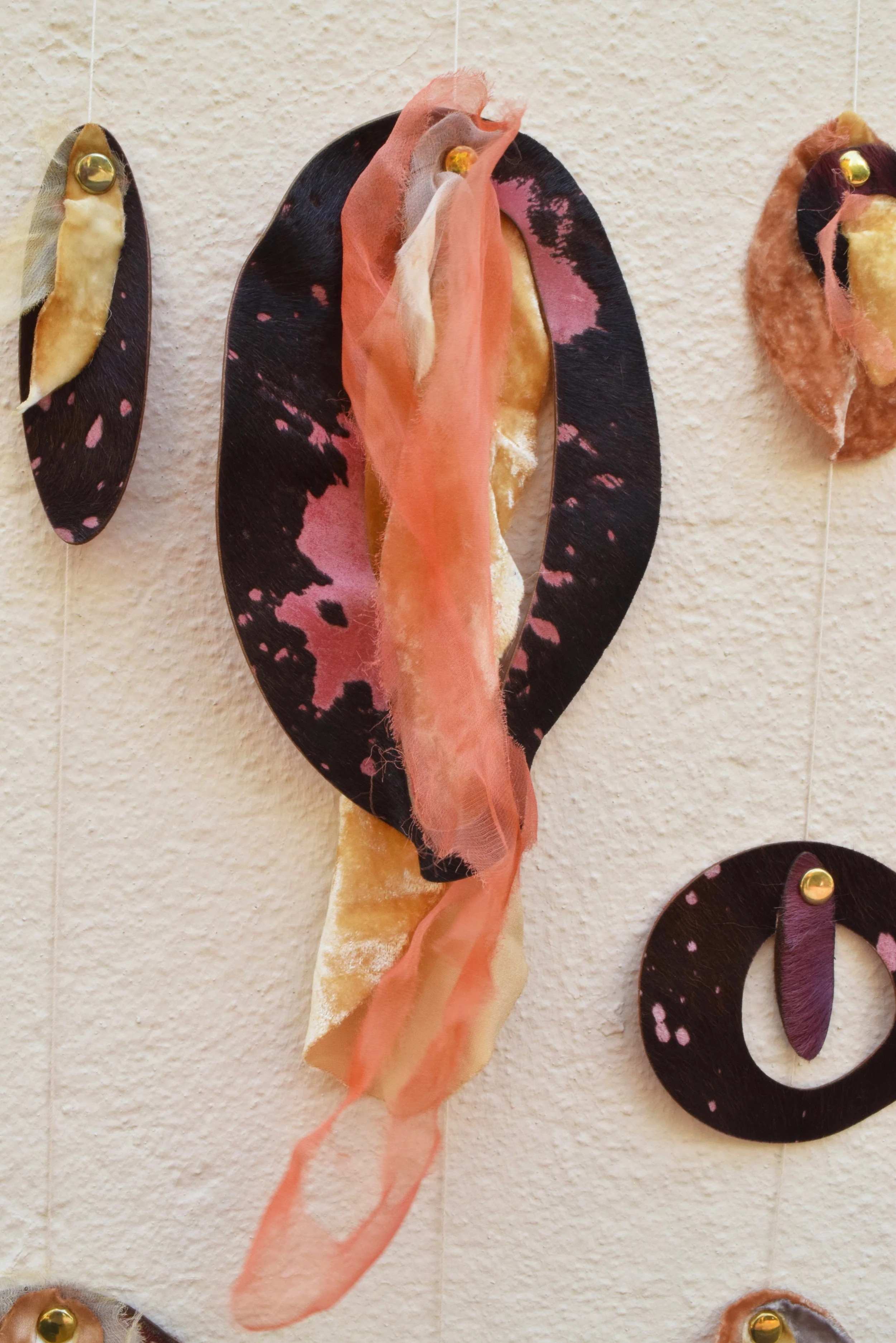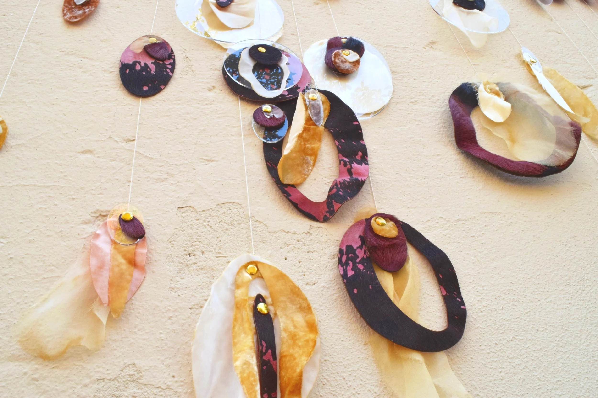 Laser cut, naturally dyed, embellished & strung, this installation offers an eclectic sea of hard and soft material surfaces.